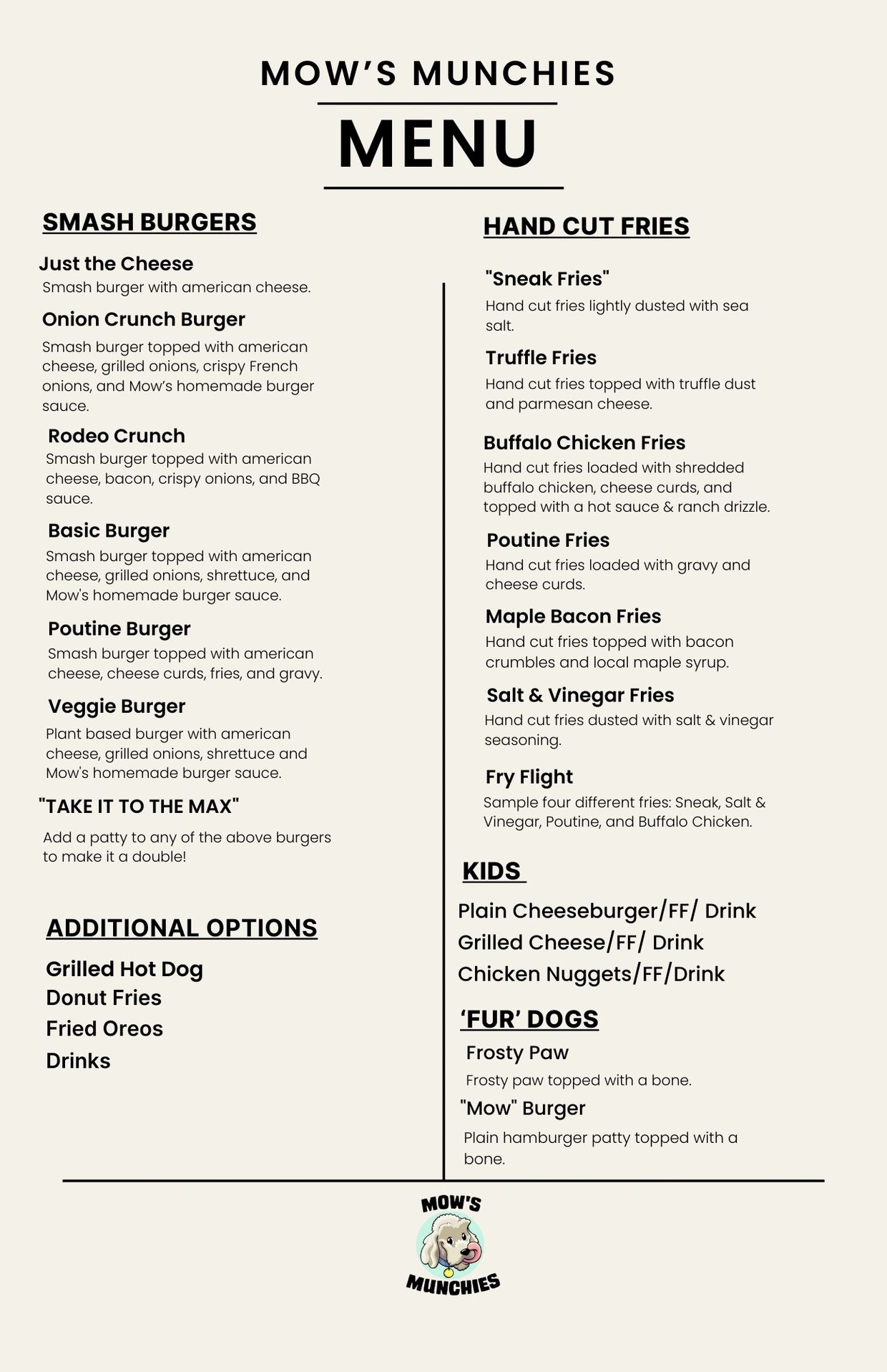 Mow's Munchies, LLC is a mobile food truck that provides made to order food, while focusing on quality and fresh ingredients! We serve a variety of smash burgers and loaded hand cut fries. We are available for weddings, birthday parties, corporate events, festivals, graduation parties, fundraisers, etc. Reach out and we are happy to provide you with more information about our services.